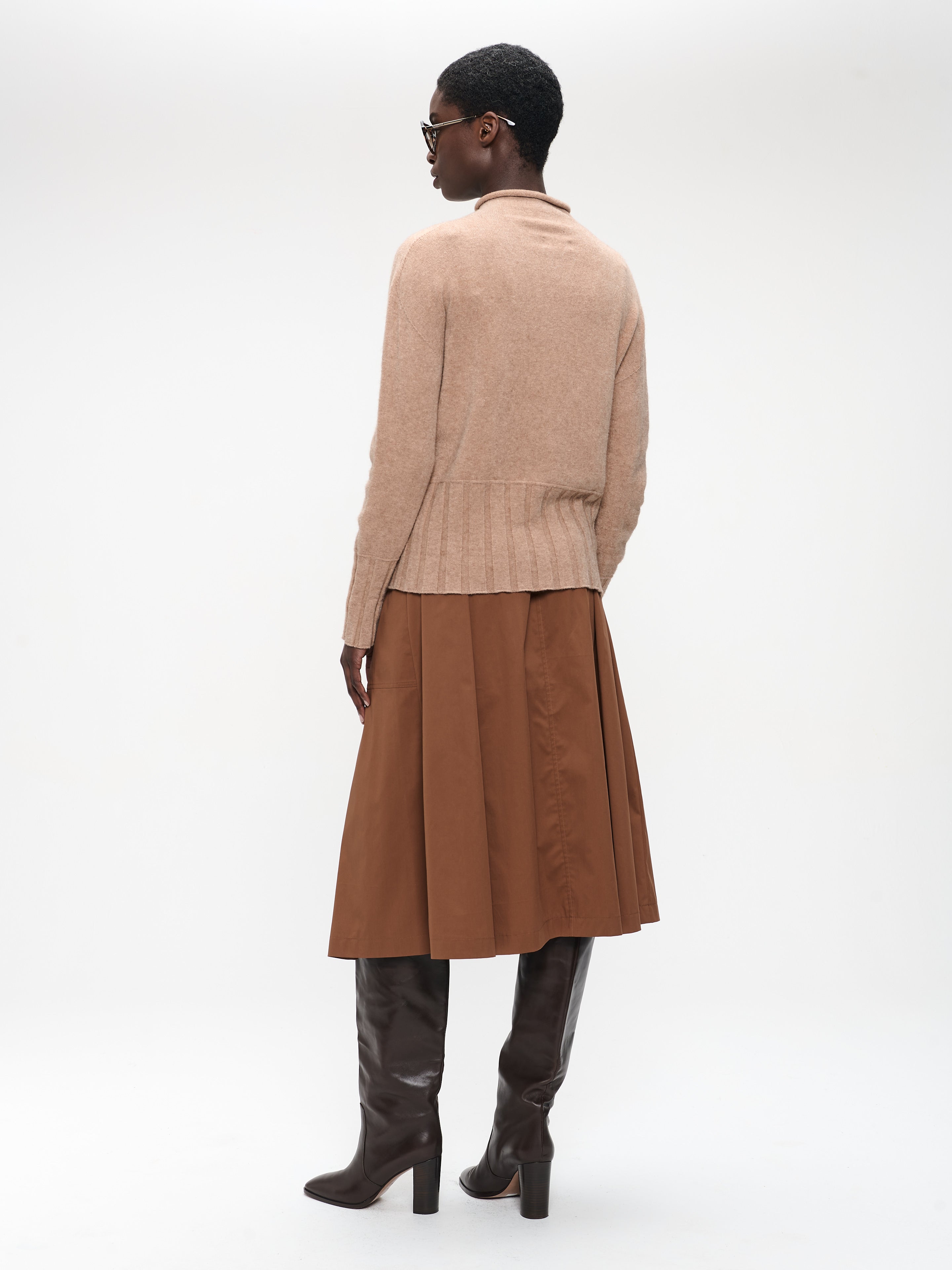 Raffaele poplin skirt is a sophisticated A-line skirt crafted from crisp cotton poplin with a structured silhouette. The high waist, adjustable drawstring belt, and elegant pleats lend a flattering and feminine shape, while the camel tone adds a warm seasonal feel. It pairs perfectly with knitwear or tailored tops, offering a timeless and comfortable look.