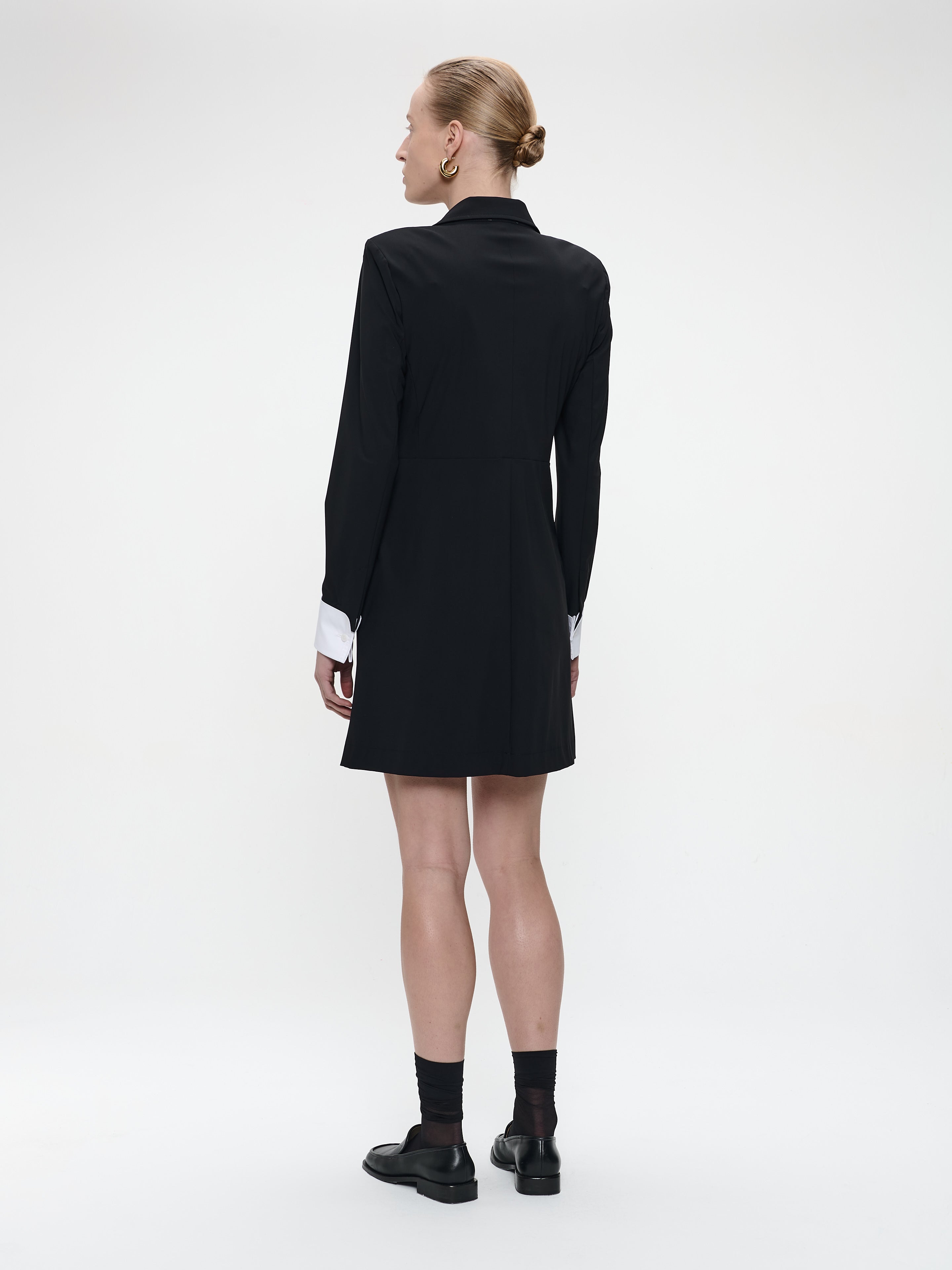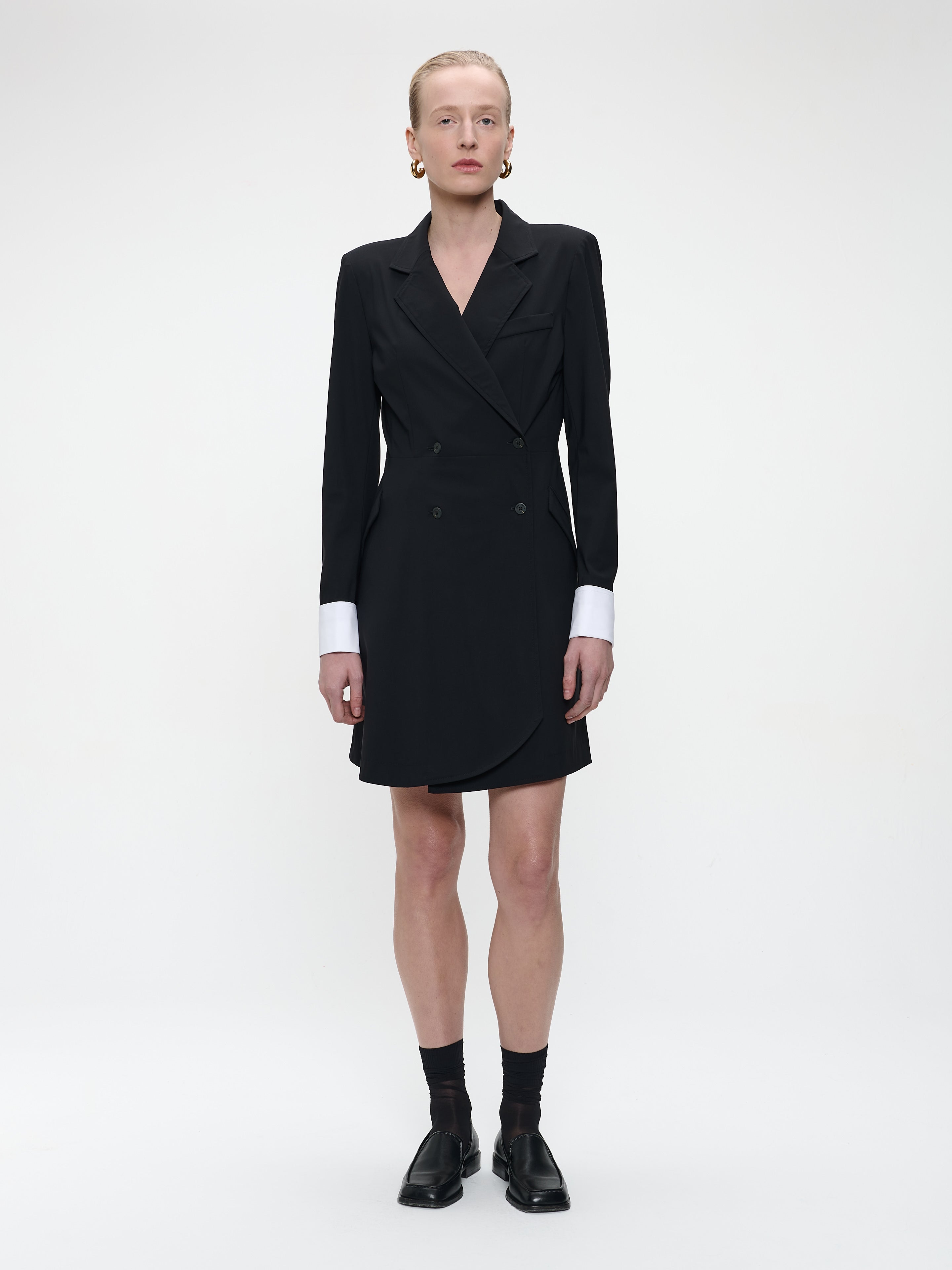 Combining sharp tailoring with feminine elegance, the Hella Dress reimagines the classic blazer silhouette into a bold, structured piece. Crafted from technical jersey, it features a double-breasted front and contrasting white cuffs that enhance its refined aesthetic. The slightly flared hemline adds movement and softens the structured look — ideal for both boardroom confidence and evening sophistication.