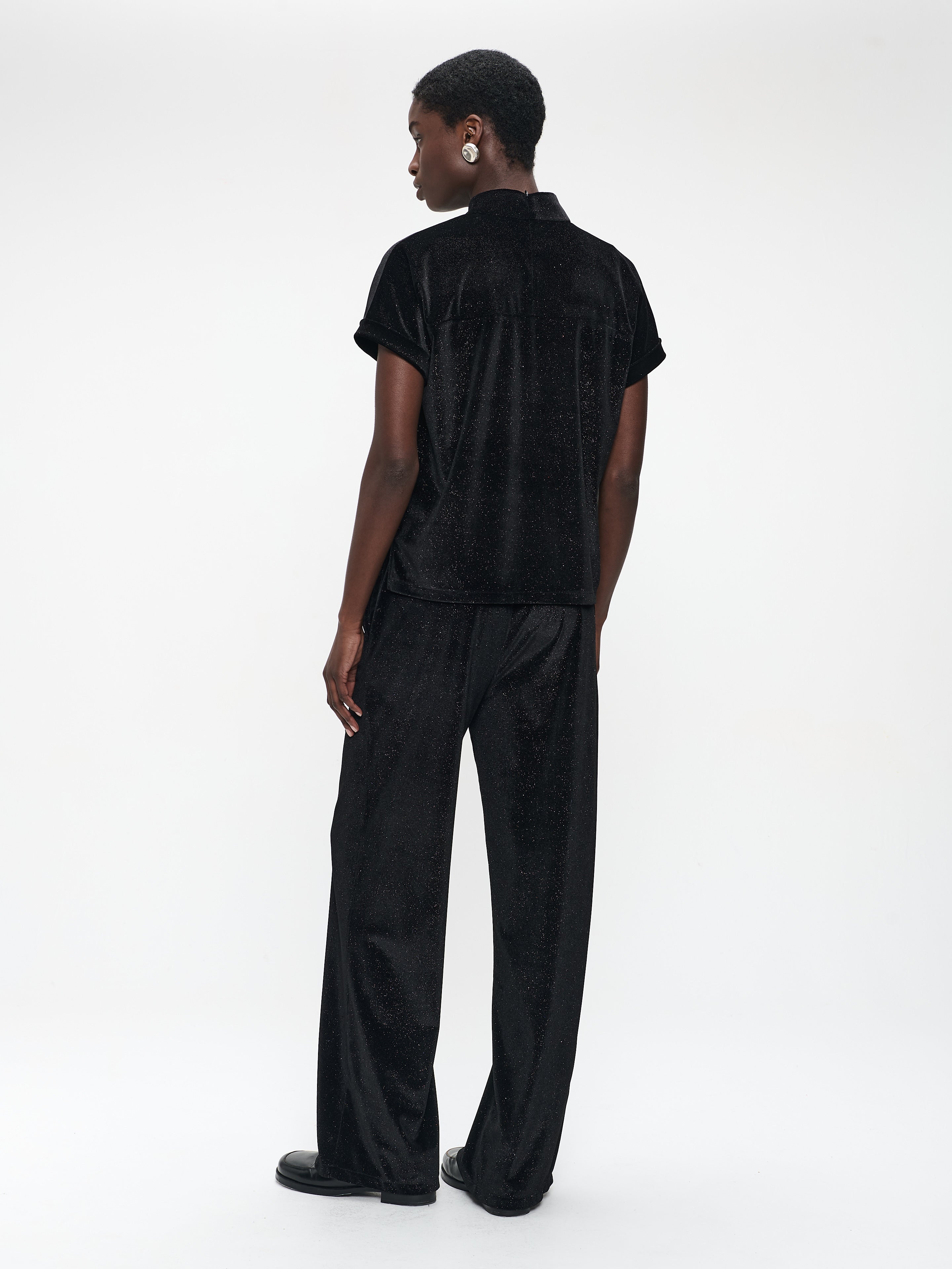 Crafted from a rich velvet fabric with a hint of stretch, the Rayan top embodies effortless elegance with a contemporary edge. Its short sleeves with rolled cuffs and slightly raised collar give it a casual-luxe feel, perfect for both day and evening looks. The shimmering texture adds a festive touch, while the relaxed silhouette ensures comfort.