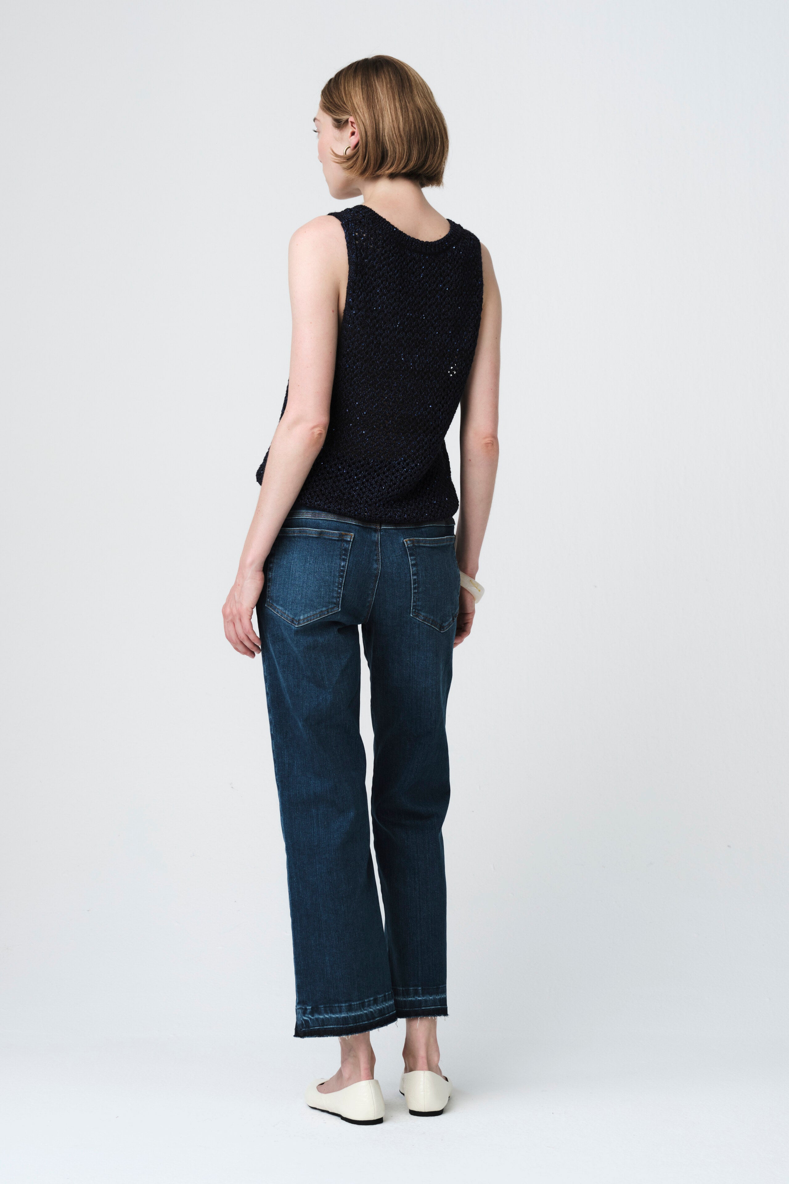 The Openwork Knit with Sequins Top 90841 by Jane Lushka combines effortless sophistication with a touch of glamour. Crafted in Italy from a soft and breathable blend of polyester, acrylic, and cotton, this sleeveless top features an airy openwork knit enhanced with delicate sequins that subtly catch the light. Its relaxed silhouette and V-neckline make it perfect for both casual and refined summer looks.