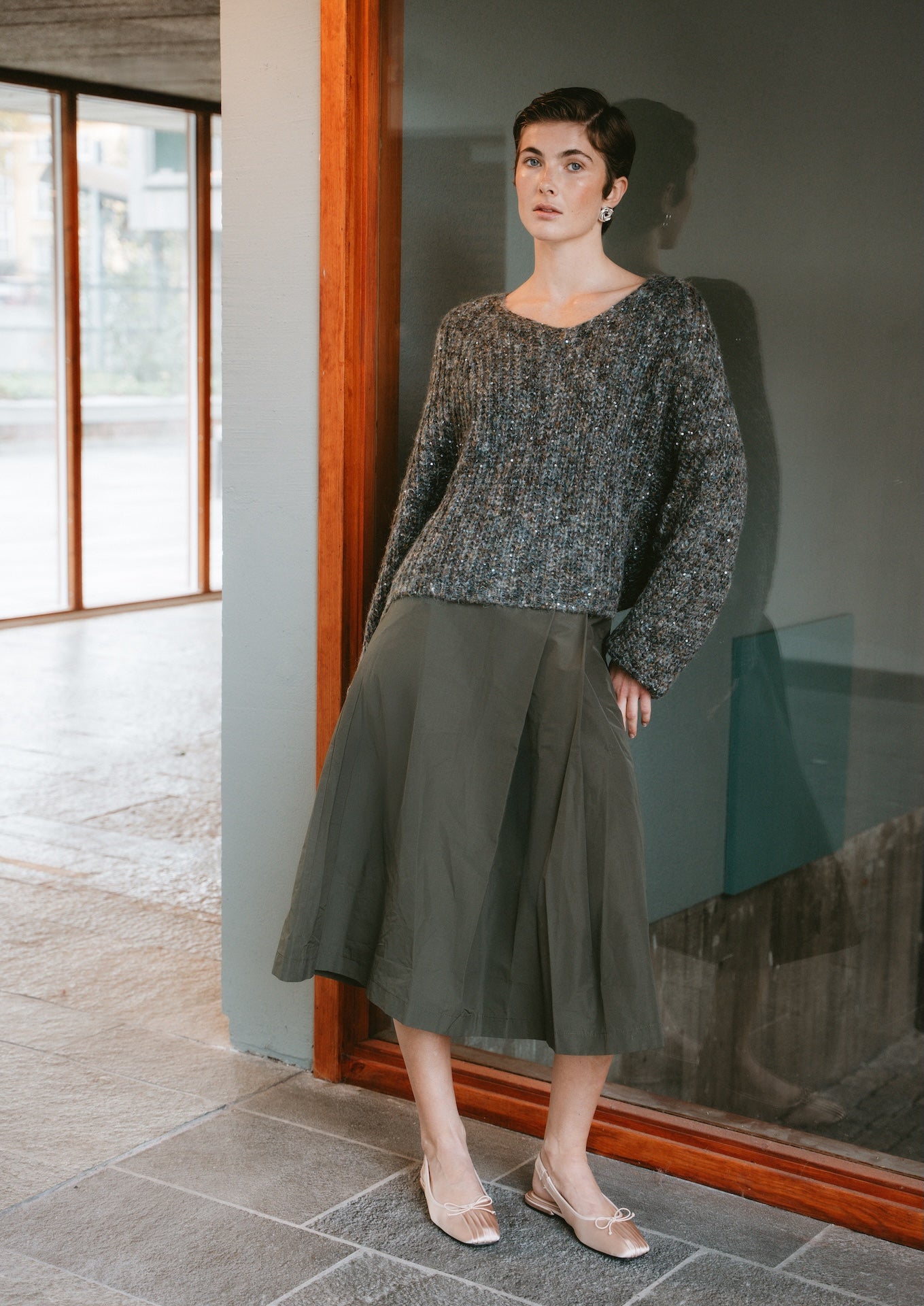 Bring a touch of edge to your seasonal wardrobe with the Nitty Eco Leather Skirt by Jane Lushka. Made from soft eco leather with a subtle sheen, this midi-length skirt combines modern attitude with effortless elegance. The high waist and slightly flared silhouette provide a flattering fit, while the flowy drape ensures comfort and movement. Whether paired with a structured blazer or a chunky knit, it adds a sophisticated twist to your everyday style.