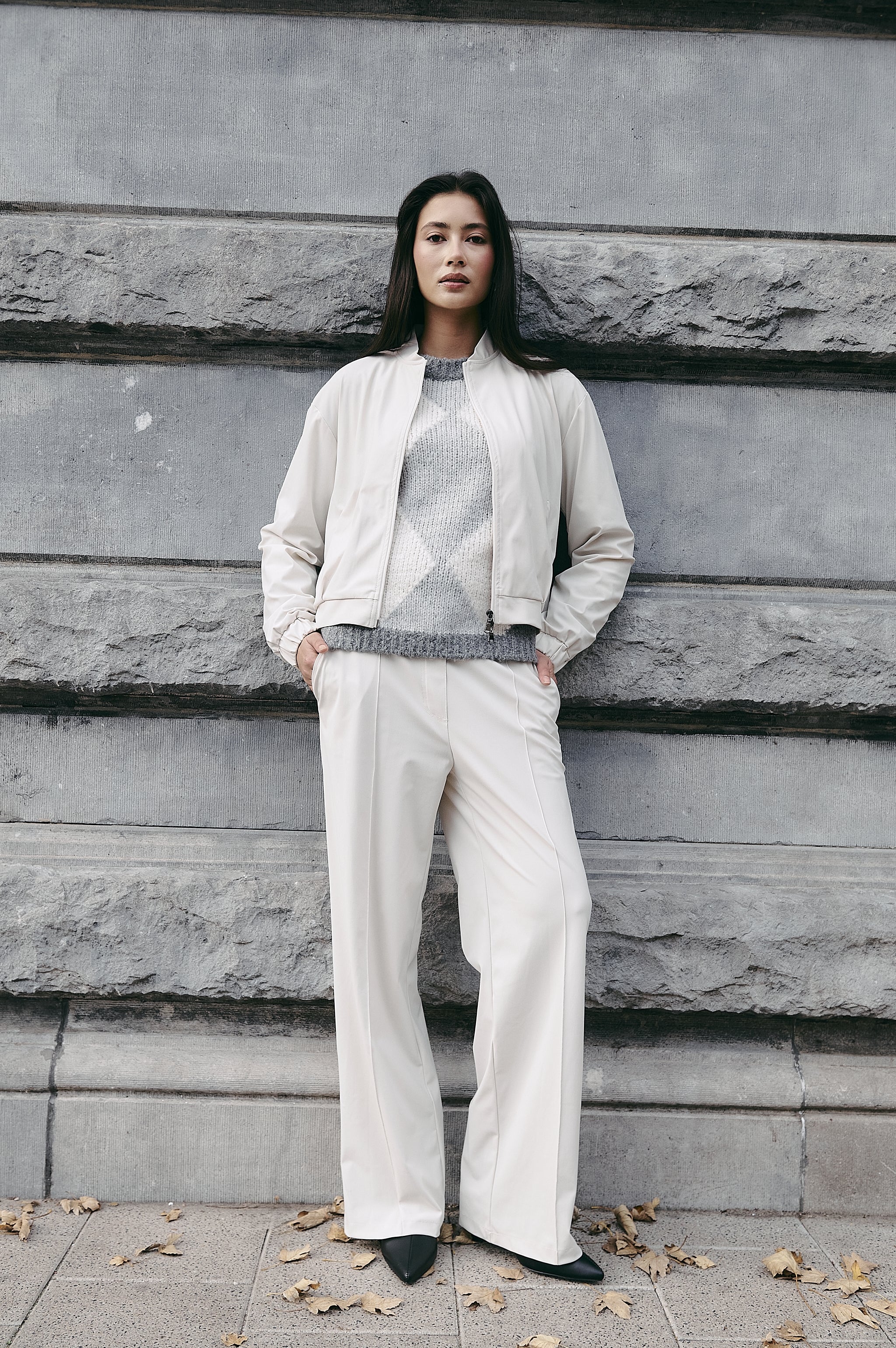 Elegant and functional, the Thera Pants offer a streamlined silhouette with tailored details. Crafted from brushed technical jersey, they feel soft against the skin and provide subtle structure. The wide-leg design and pressed creases create a polished look, while the mid-rise waistband ensures everyday comfort — perfect for both office and formal occasions.
