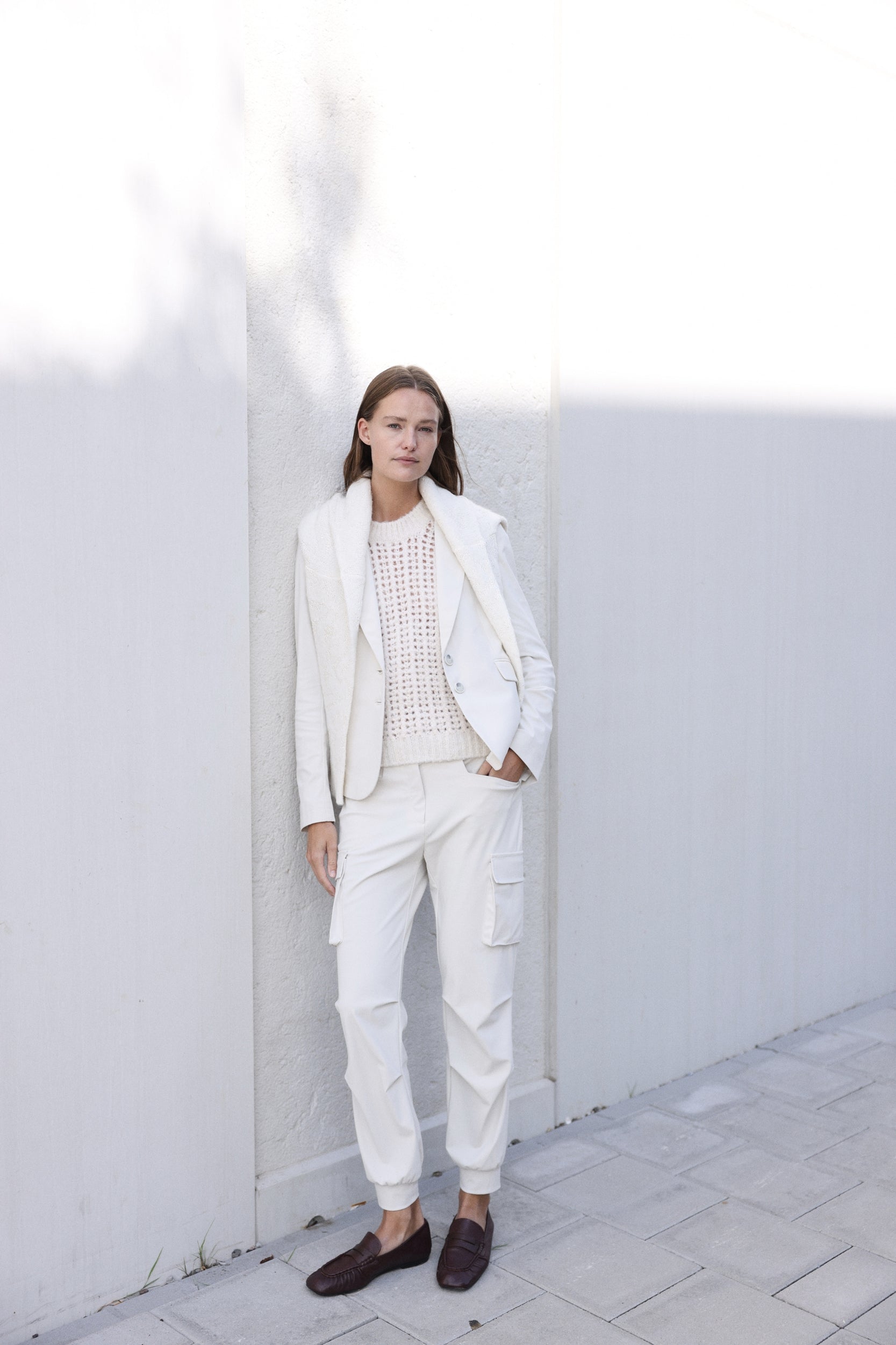 The Timelia Pants blend modern structure with cozy appeal. Cut from a soft technical jersey with suede-like texture, they feature a tapered leg and cuffed hems for a sleek yet relaxed silhouette. Ideal for cooler seasons, they offer both style and ease — perfect for pairing with matching tops or chunky knits.