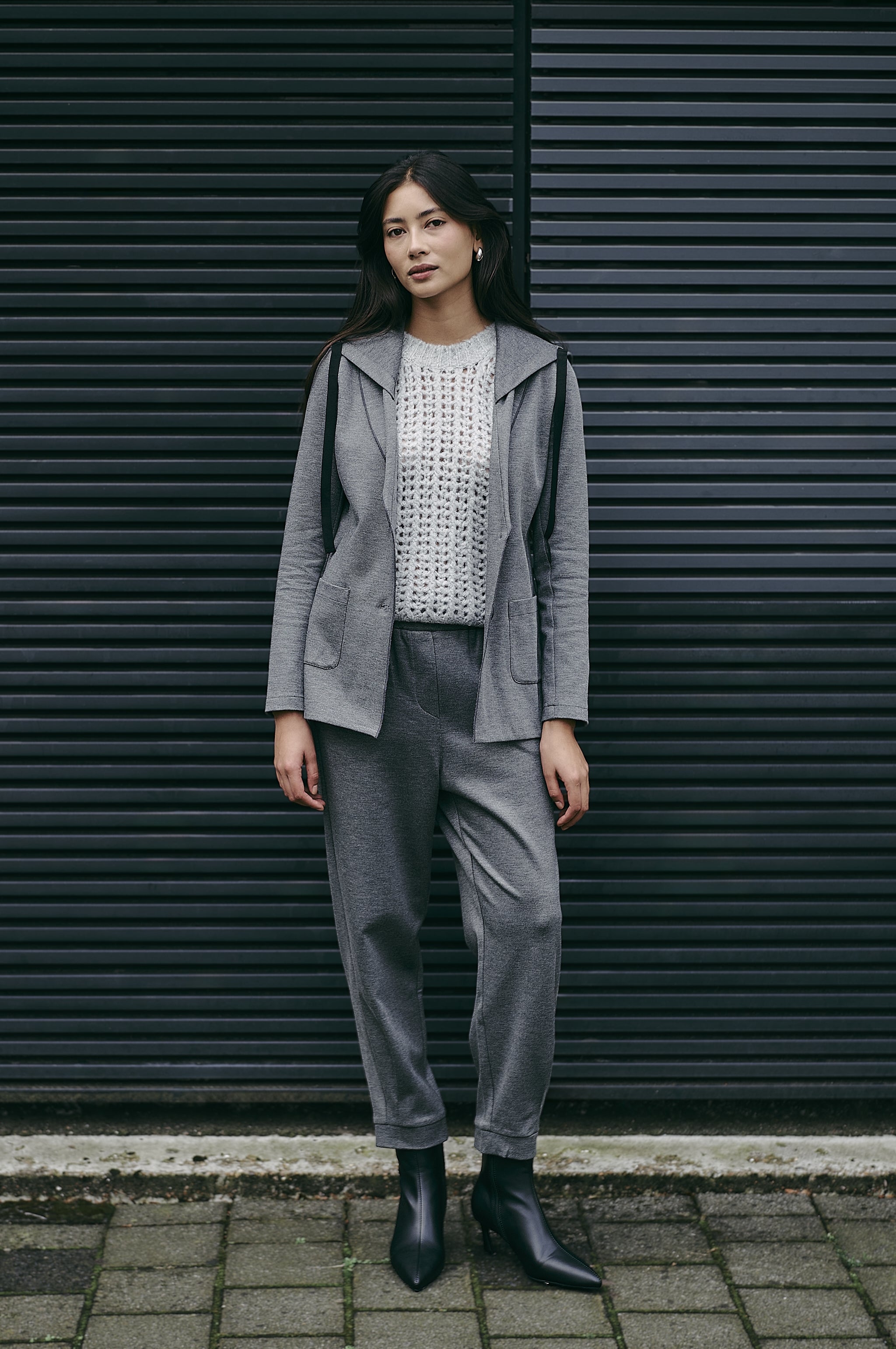 Comfort meets contemporary tailoring in the Emy hoody blazer by Jane Lushka. Crafted from a soft and breathable viscose blend, this jacket features a subtle hood detail, creating a modern silhouette that perfectly blends casual ease with sophisticated flair. The tailored fit and functional pockets elevate its relaxed nature, making it a go-to piece for stylish layering in the colder seasons.