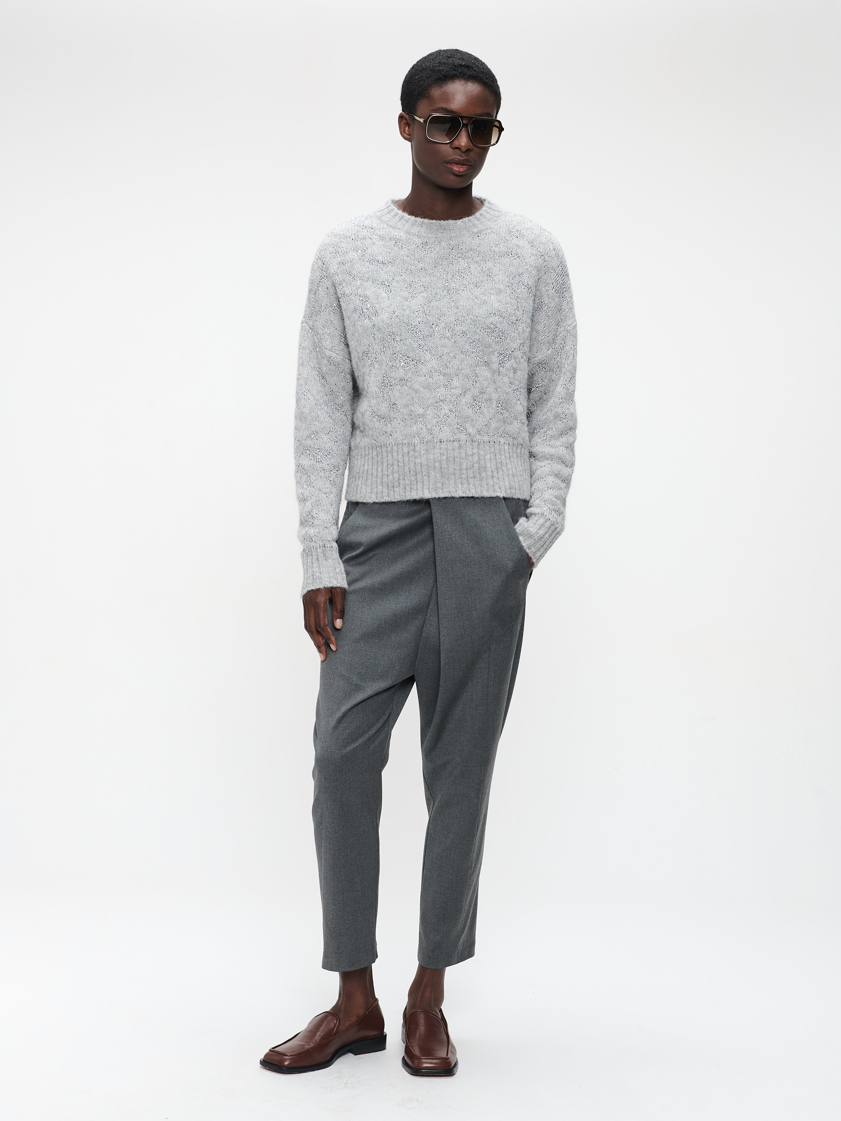 Elegant and functional, the Thera Pants offer a streamlined silhouette with tailored details. Crafted from brushed technical jersey, they feel soft against the skin and provide subtle structure. The wide-leg design and pressed creases create a polished look, while the mid-rise waistband ensures everyday comfort — perfect for both office and formal occasions.