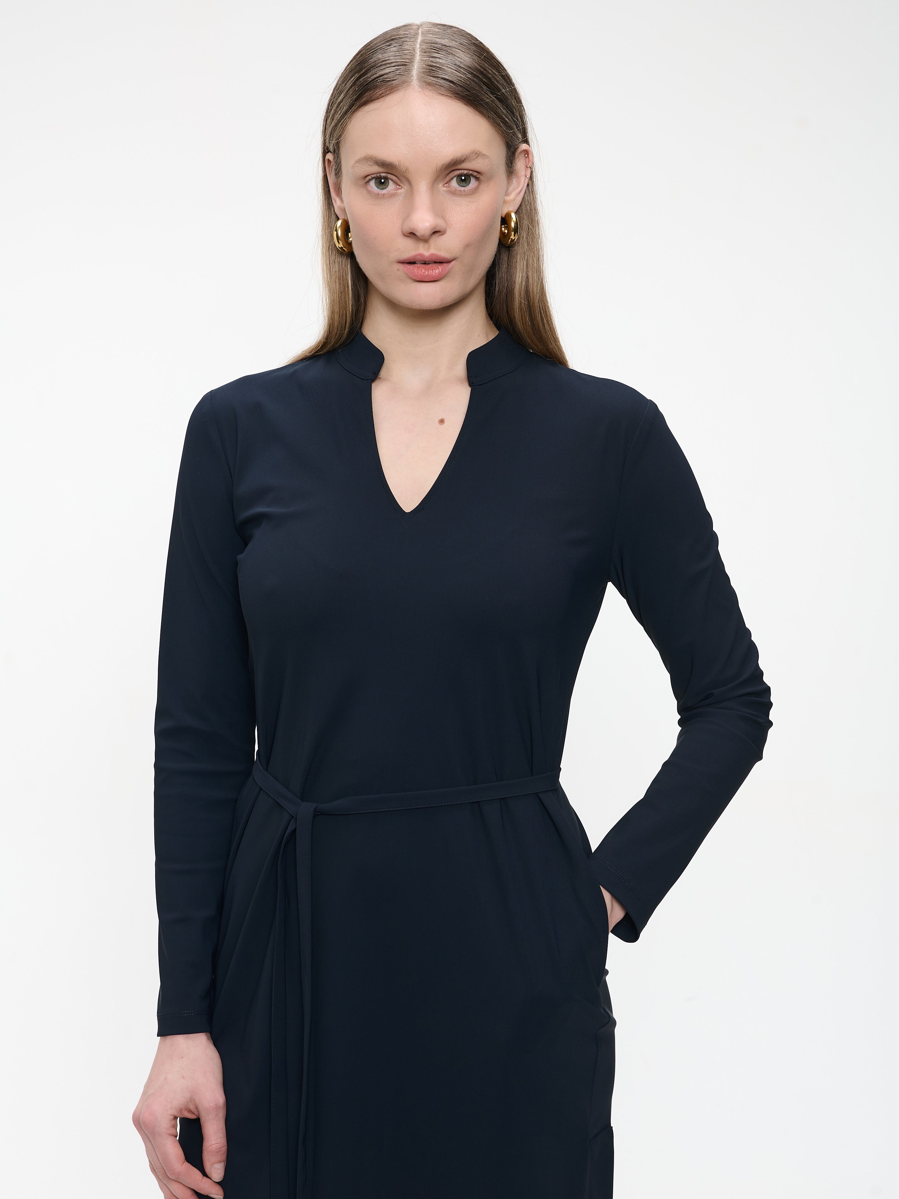 Effortlessly chic, the Gerrie Dress is your go-to for everyday elegance. Made from soft technical jersey, this long-sleeved dress combines comfort with style. The flattering V-neckline and matching waist tie enhance the feminine silhouette, while the knee-length cut keeps it versatile — perfect for both work and casual outings.