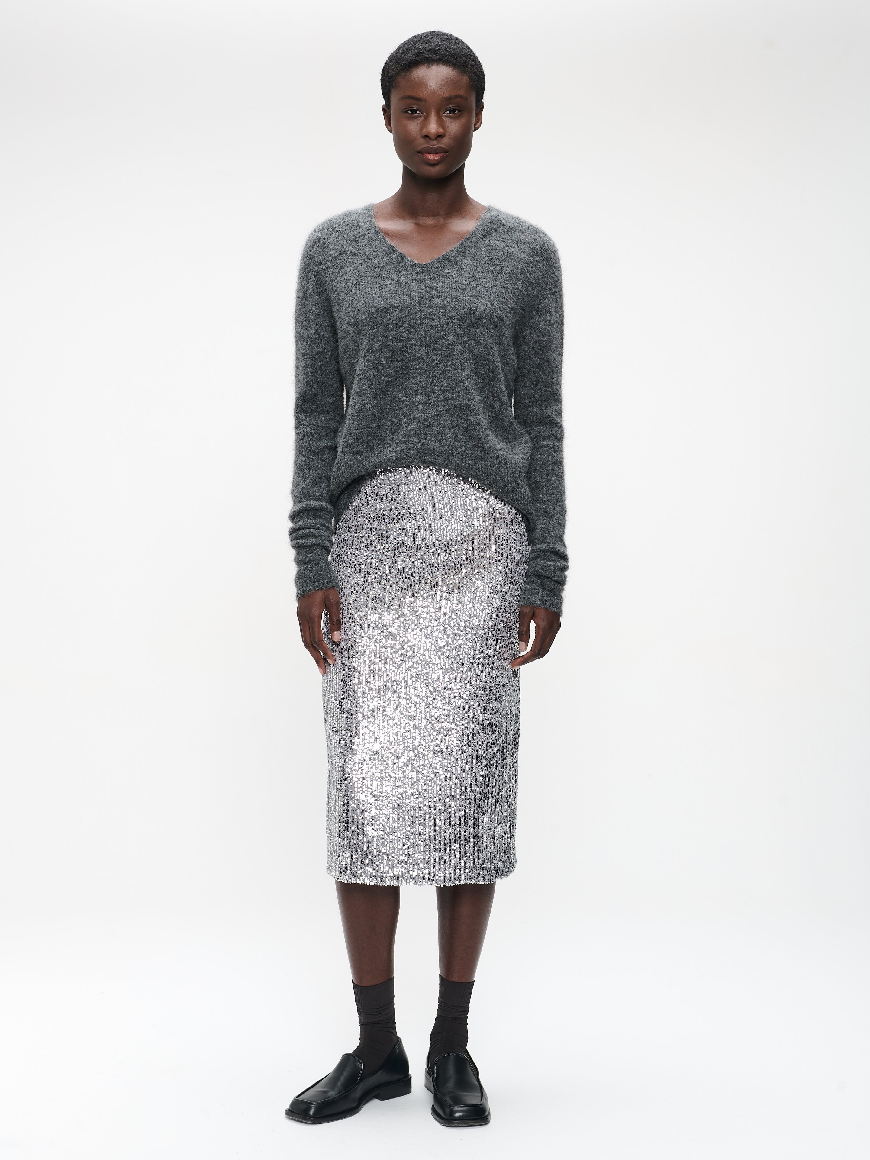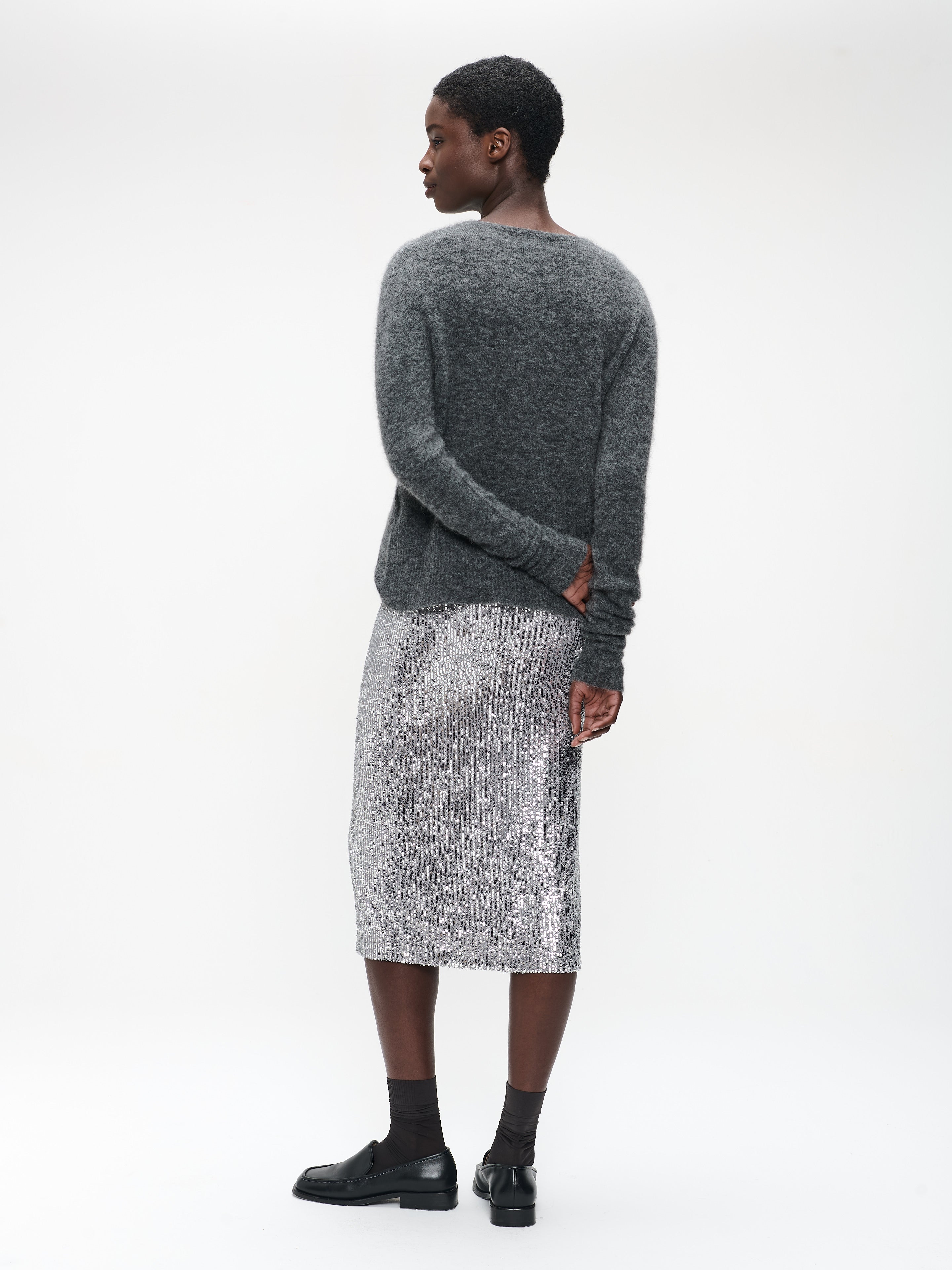 The Pullover shiny alpaca H24423 is an elegant knit that merges cozy comfort with a subtle sheen. Crafted in a soft and lightweight blend, this pullover stands out with its fine texture and versatile silhouette. The simple, round neckline and straight fit make it an ideal choice for effortless layering or standalone sophistication.
