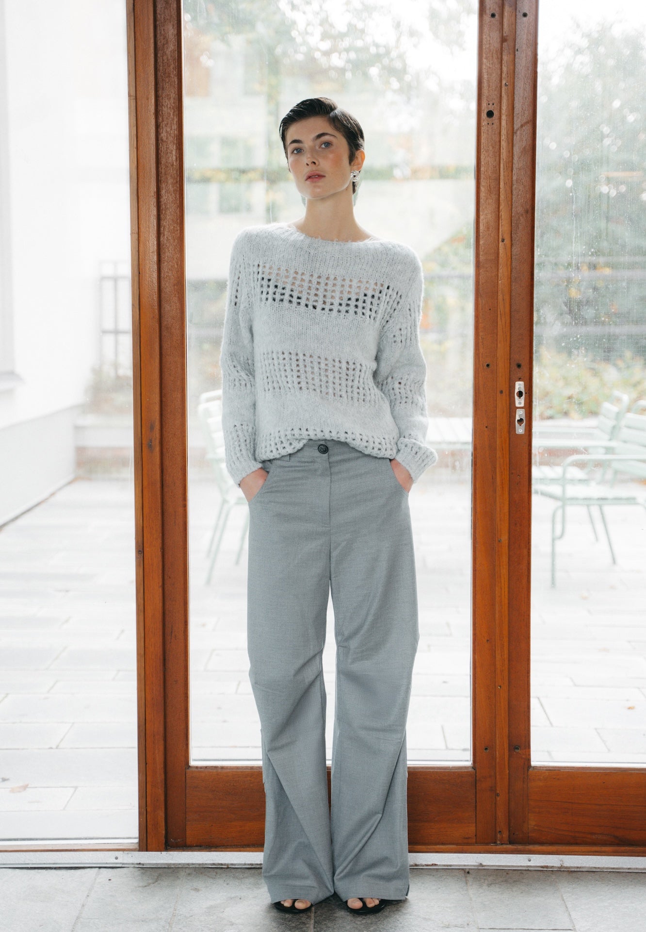 Shiny Pullover 1034 brings a unique twist to everyday knitwear with its semi-sheer open-knit structure and subtly shimmering yarns. The pullover combines a boxy silhouette with a slightly shorter length, making it a great match for both high-waisted trousers and skirts. Its soft off-white shade adds a clean and cozy finish to your seasonal wardrobe.