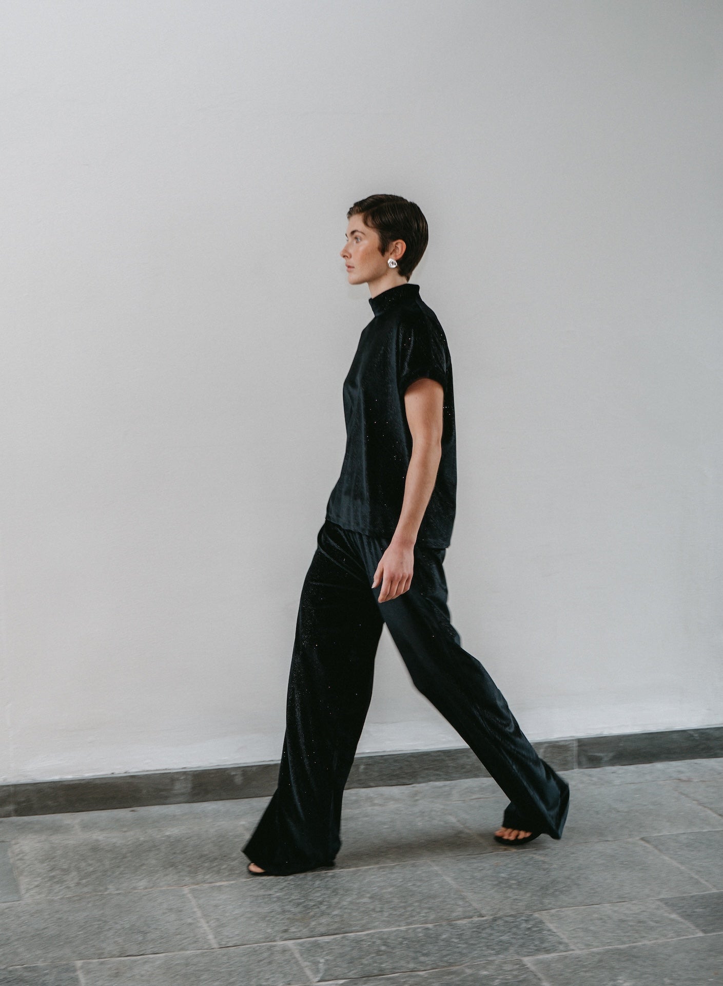 Crafted from a rich velvet fabric with a hint of stretch, the Rayan top embodies effortless elegance with a contemporary edge. Its short sleeves with rolled cuffs and slightly raised collar give it a casual-luxe feel, perfect for both day and evening looks. The shimmering texture adds a festive touch, while the relaxed silhouette ensures comfort.