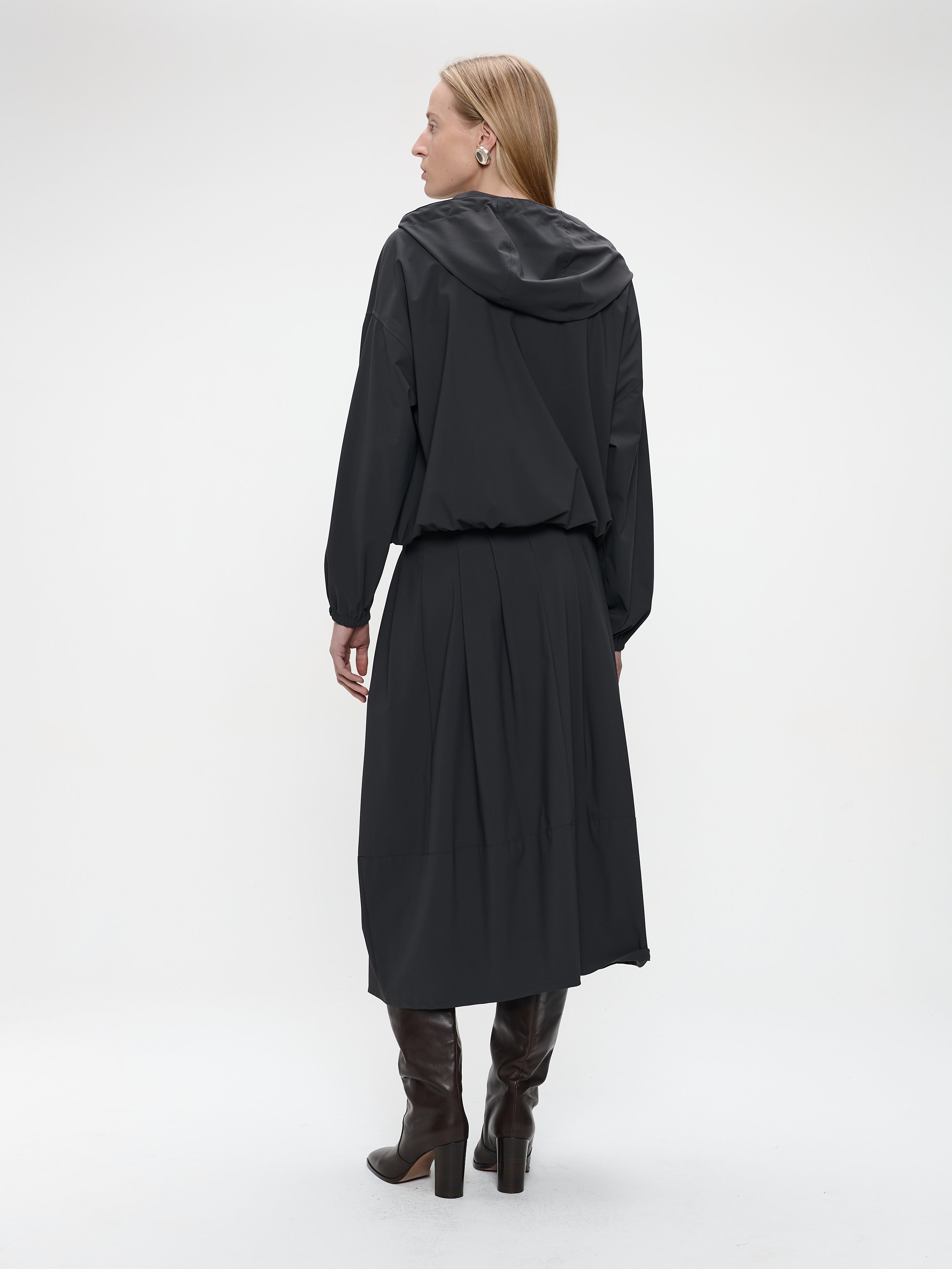 The Misi jacket (SU125129) is the perfect fusion of sporty comfort and everyday elegance. Made from soft technical jersey, this hooded jacket features a relaxed fit with elasticated cuffs and hem, creating a slightly voluminous silhouette. The front zipper adds function and edge, while the matte black fabric brings understated sophistication. Perfect for laid-back styling or layered with tailored pieces.